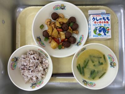 牛乳 元気ごはん 鶏肉団子とカシューナッツ炒め 中華風コーンスープ