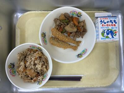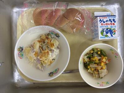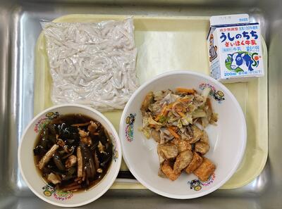 牛乳 肉汁うどん さといもでんがく おかかいため