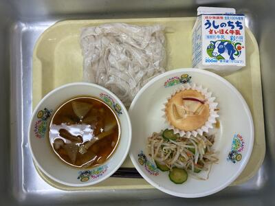 牛乳 ほうとううどん もやしのあえもの ざくざくりんごケーキ