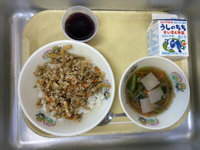 牛乳 そぼろ丼 こめこのワンタンスープ ブルーベリーゼリー