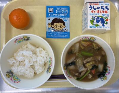 今日から3学期の給食が始まりました。食べやすいよう丼ものの献立です。玄米団子汁は、埼玉県産の玄米100%のものを使用しています。