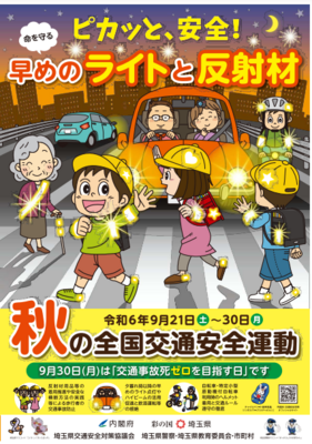 秋の全国交通安全運動期間です。 投稿: 管理者 (2024/09/21) カテゴリー: 連絡事項 秋の全国交通安全運動が9/21~9/30で実施となります。 児童はもちろん、保護者・地域の皆様においても、交通安全に留意してお過ごしください。