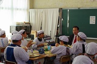 6年3組の生徒と小野市長が教室で給食を食べました。