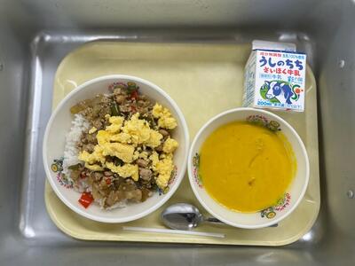 きょうはハロウィンにちなんだパンプキンスープです。食べ物でイベントも盛り上がります。