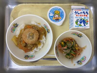 11/17の給食 投稿: 情報担当 (11/17) 牛乳 豆乳カレーライス オケちゃんコロッケ 大根サラダ オケちゃんゼリー(サイダー風ゼリー) 桶川市市政55周年をお祝いする給食です。コロッケとゼリーがオケちゃんになっています。 -