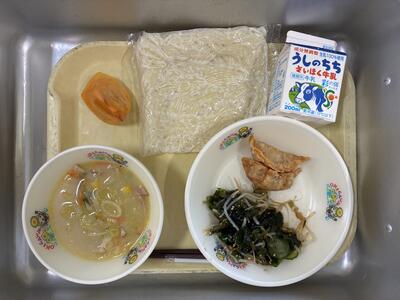 牛乳 とんこつラーメン 揚げギョウザ 海草サラダ 柿
