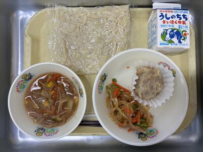 牛乳 みそラーメン 手作りしゅうまい 大根のサラダ