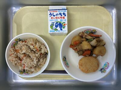 1/21の給食 投稿: 情報担当 (01/21) 牛乳 どんどろけめし オニポテコロッケ はっすん どんどろけめしは、島根県の郷土料理です。出雲の方言で、「どんどろけ」は「カミナリ」のことを指します。具材の豆腐を炒めるときになる音がカミナリのように聞こえることからついた名前ともいわれています。 -