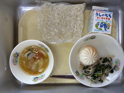 2/5の給食 投稿: 情報担当 (02/05) 牛乳 塩バターラーメン 肉まん 中華和え 今月は北海道の郷土料理をテーマに献立が盛り込まれています。今日はその一つで、北海道三大ラーメン、函館の塩ラーメンです。北海道で有名なバターを入れました。 -