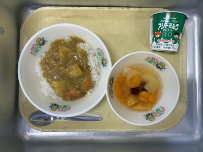 桶川西小学校オリジナルの献立です。フルーツポンチには、桃、りんご、パインと、巨峰のゼリーが入っています。
